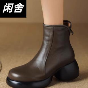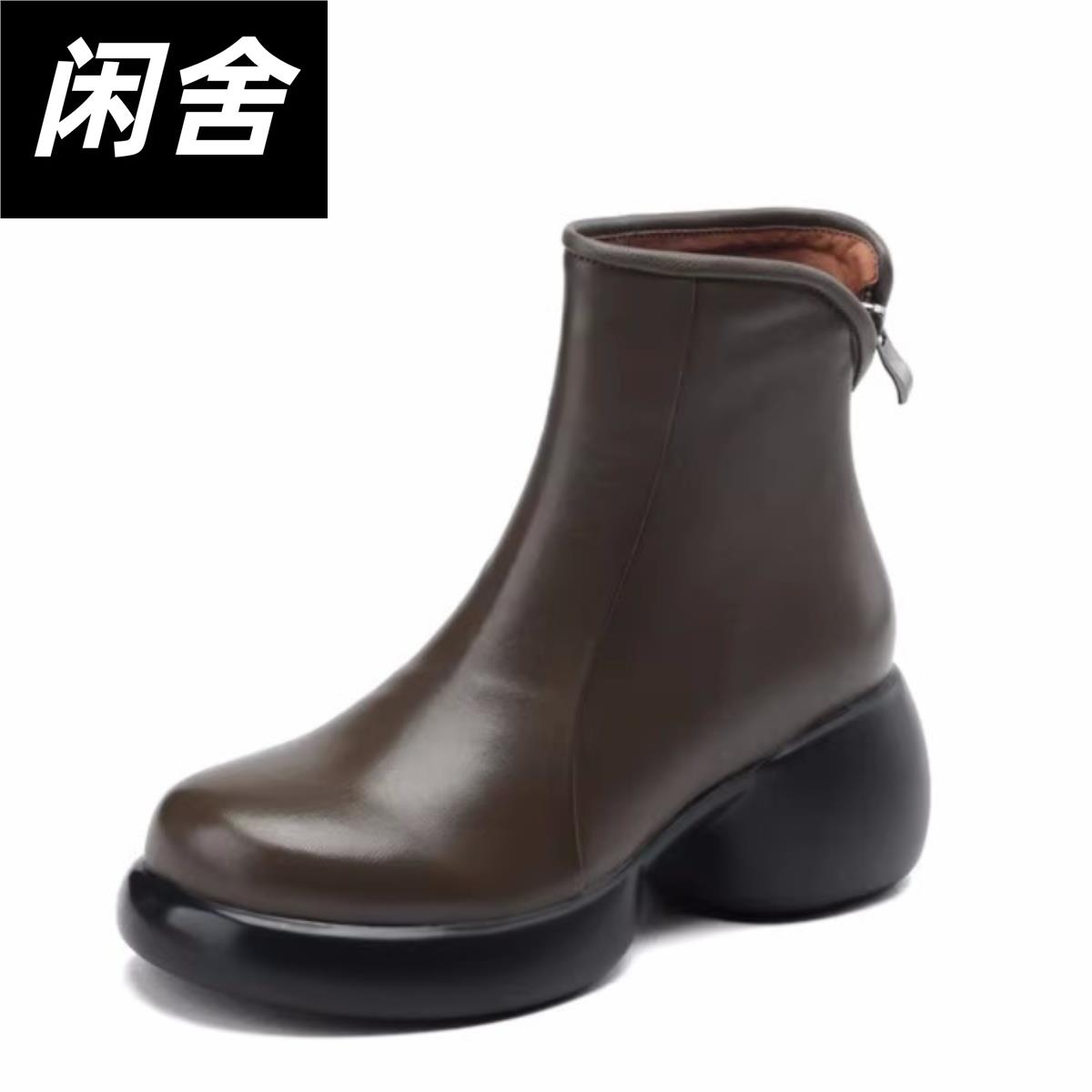 內(nèi)增高復(fù)古短靴女2025秋冬西部馬丁靴圓頭短筒勃肯堆堆靴 牛皮版
