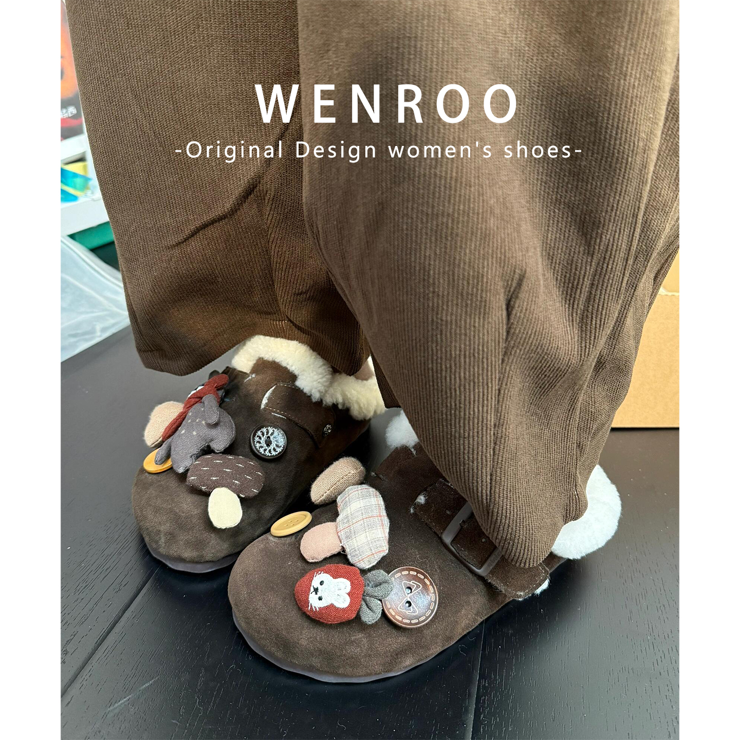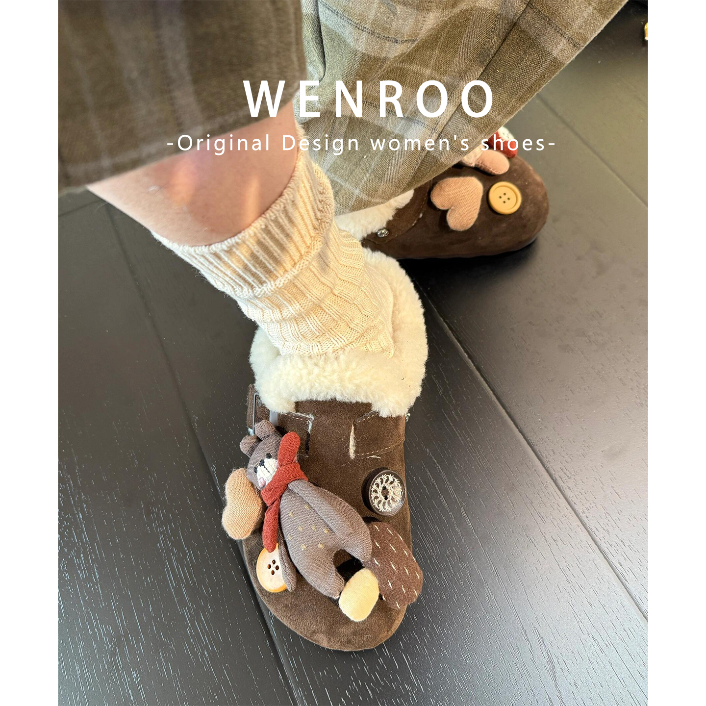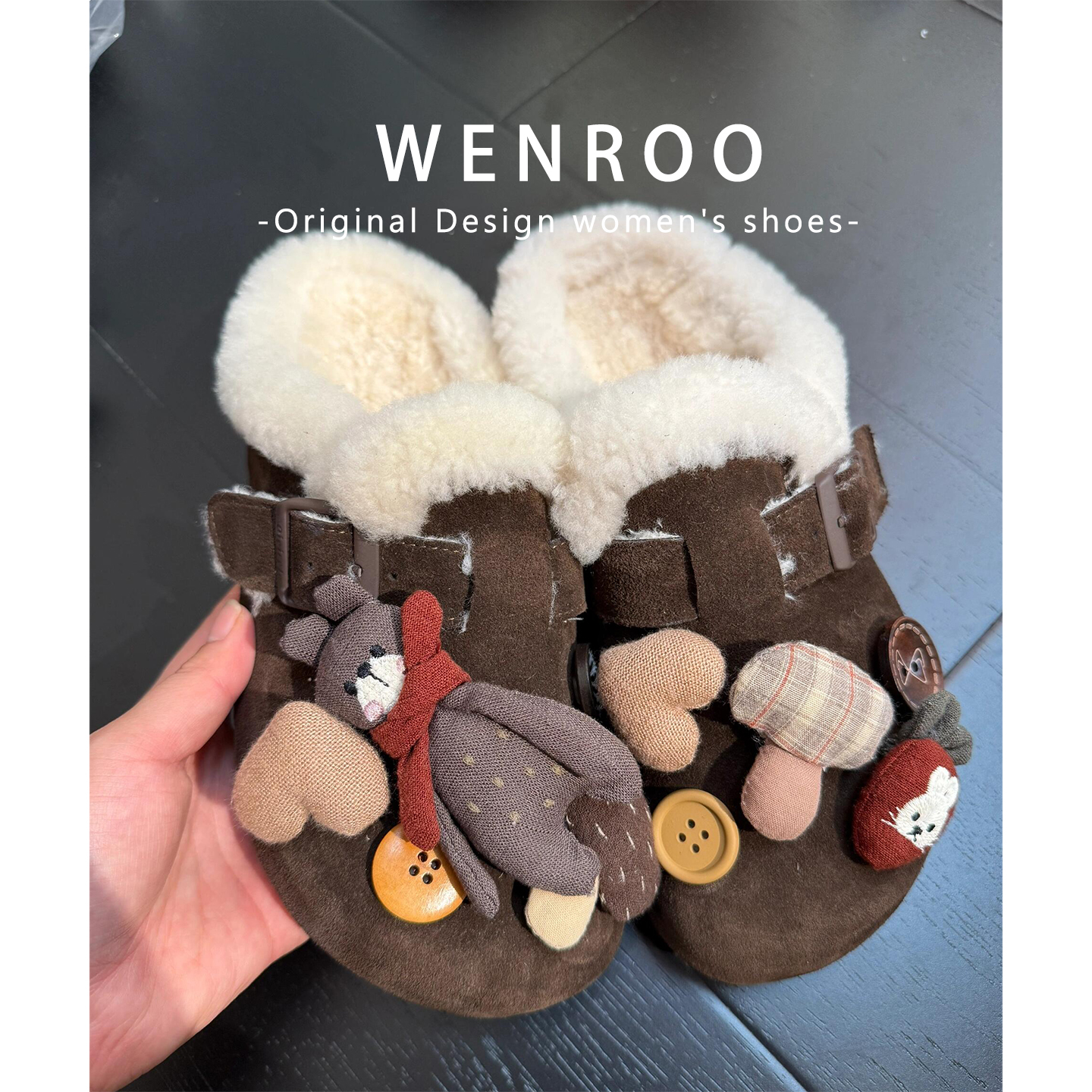 小熊裝 女秋外穿2025新款 棕色厚底加絨勃肯鞋 飾厚底毛毛包頭半拖鞋由