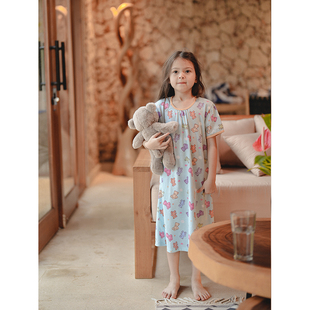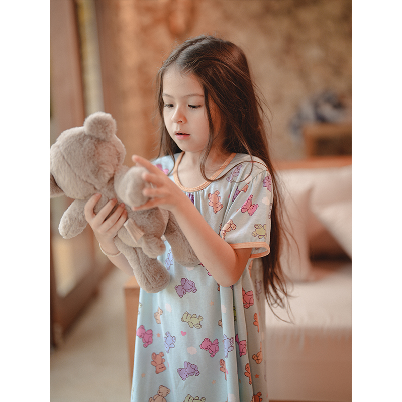 小熊印花短袖 連衣裙女童可愛睡衣 兒童睡裙女孩2024新款 史豌豆童裝由