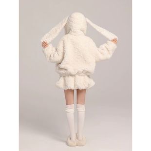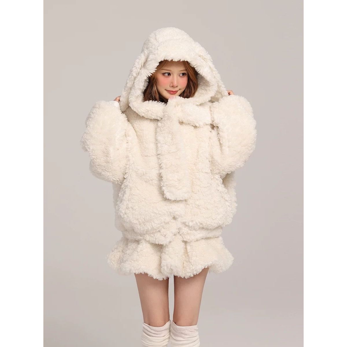 新款 可愛小熊毛絨耳朵連帽毛絨絨保暖外套上衣短裙女 冬季 奶系套裝由