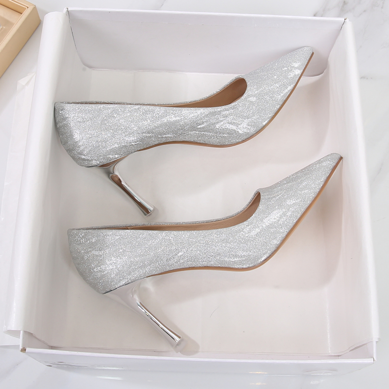 水晶伴新娘婚鞋 秀禾婚紗兩穿舒適 銀色尖頭細(xì)跟女單鞋 香檳金高跟鞋由