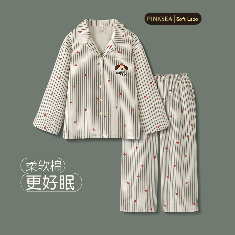 Pinksea睡衣女春秋純棉長(zhǎng)袖 情侶家居服可外穿大碼 男女士套裝 長(zhǎng)褲由