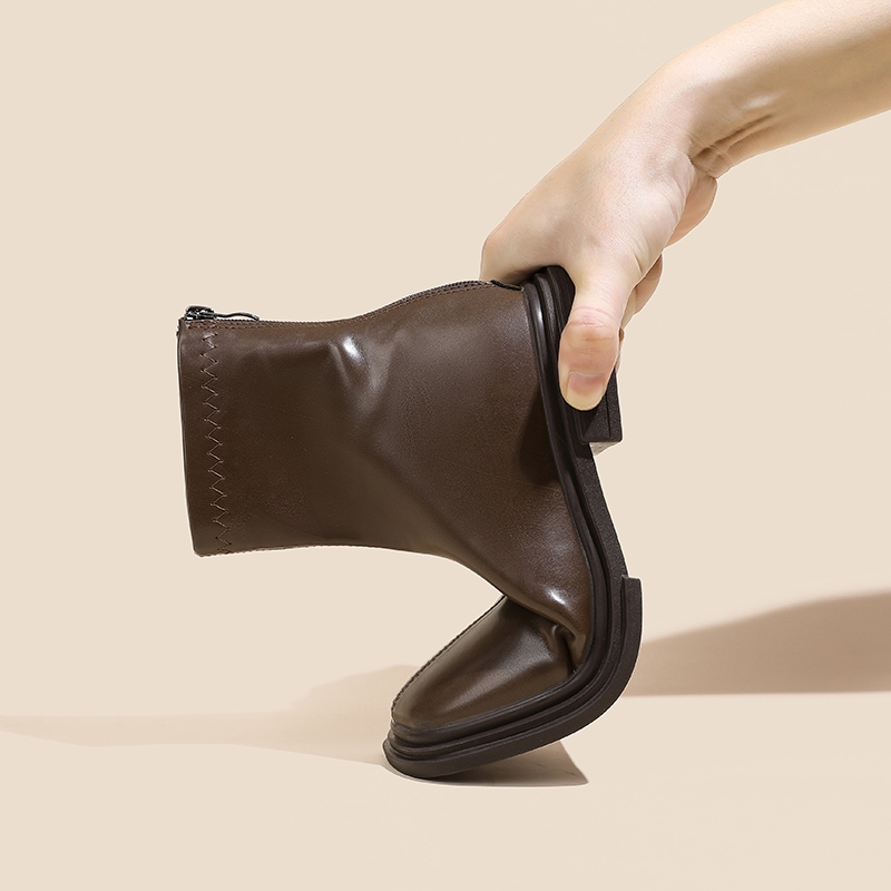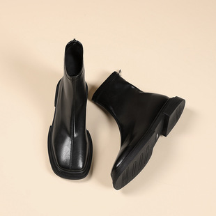 法式 熱風高跟時裝 靴2025年冬季 新款 方頭粗跟短靴通勤休閑靴子女鞋
