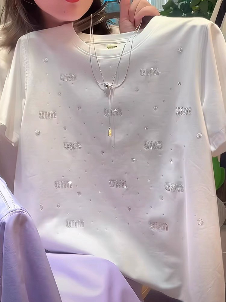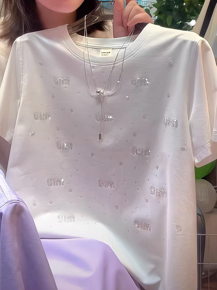 otren歐貨重工燙鉆字母短袖 正肩滿鉆圓領(lǐng)通勤上衣 T恤女夏2025新款由