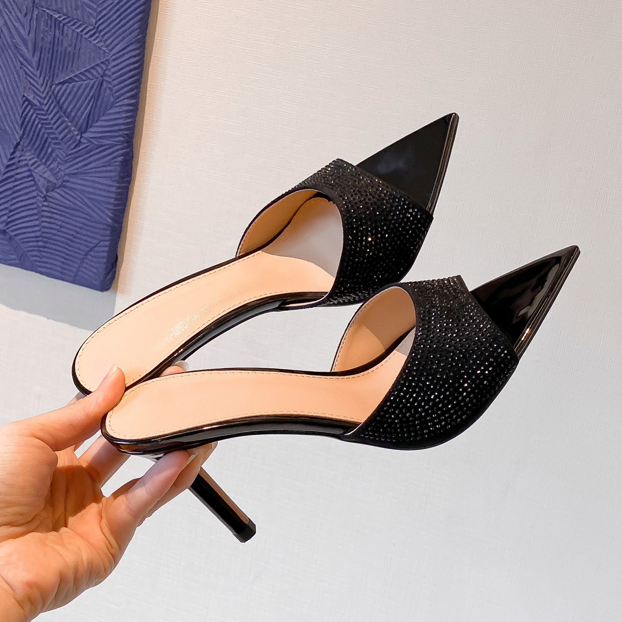 水鉆絕美高跟鞋 新款 細跟尖頭小眾風性感御姐一字帶涼拖鞋 2025夏季由