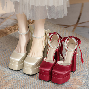 包頭中空單鞋 15CM恨天高跟鞋 法式 新款 粗跟防水臺紅色婚鞋 2025秋季由