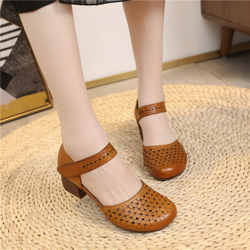 女媽媽鞋 中跟粗跟軟底包頭包跟鏤 民族風真皮復古涼鞋 659小花涼鞋由