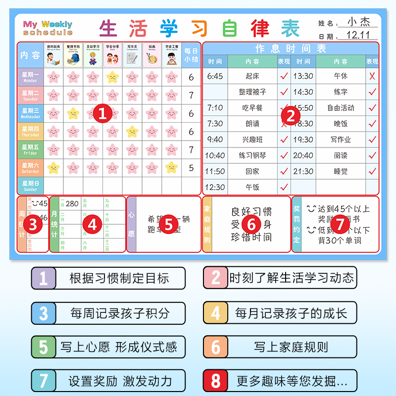 兒童成長自律表墻貼小學(xué)生獎勵好習(xí)慣學(xué)習(xí)自律成長積分記錄生活小孩規(guī)矩表時間管理幼兒園暑假寒假計劃安排表