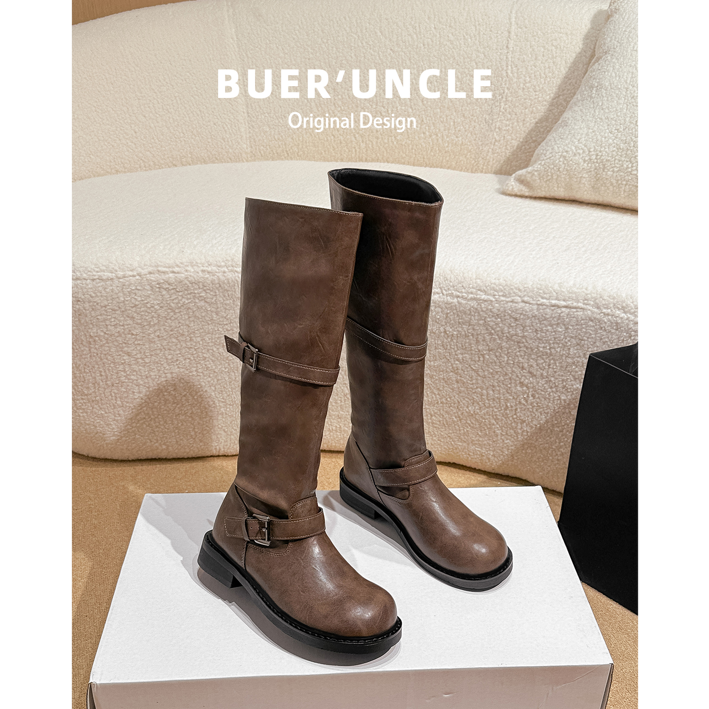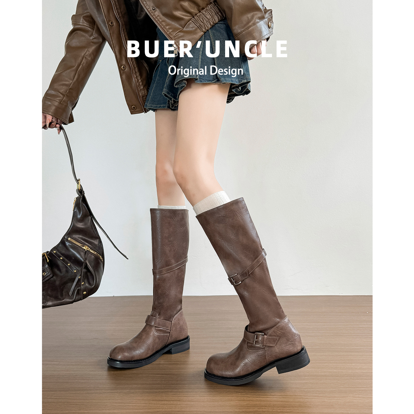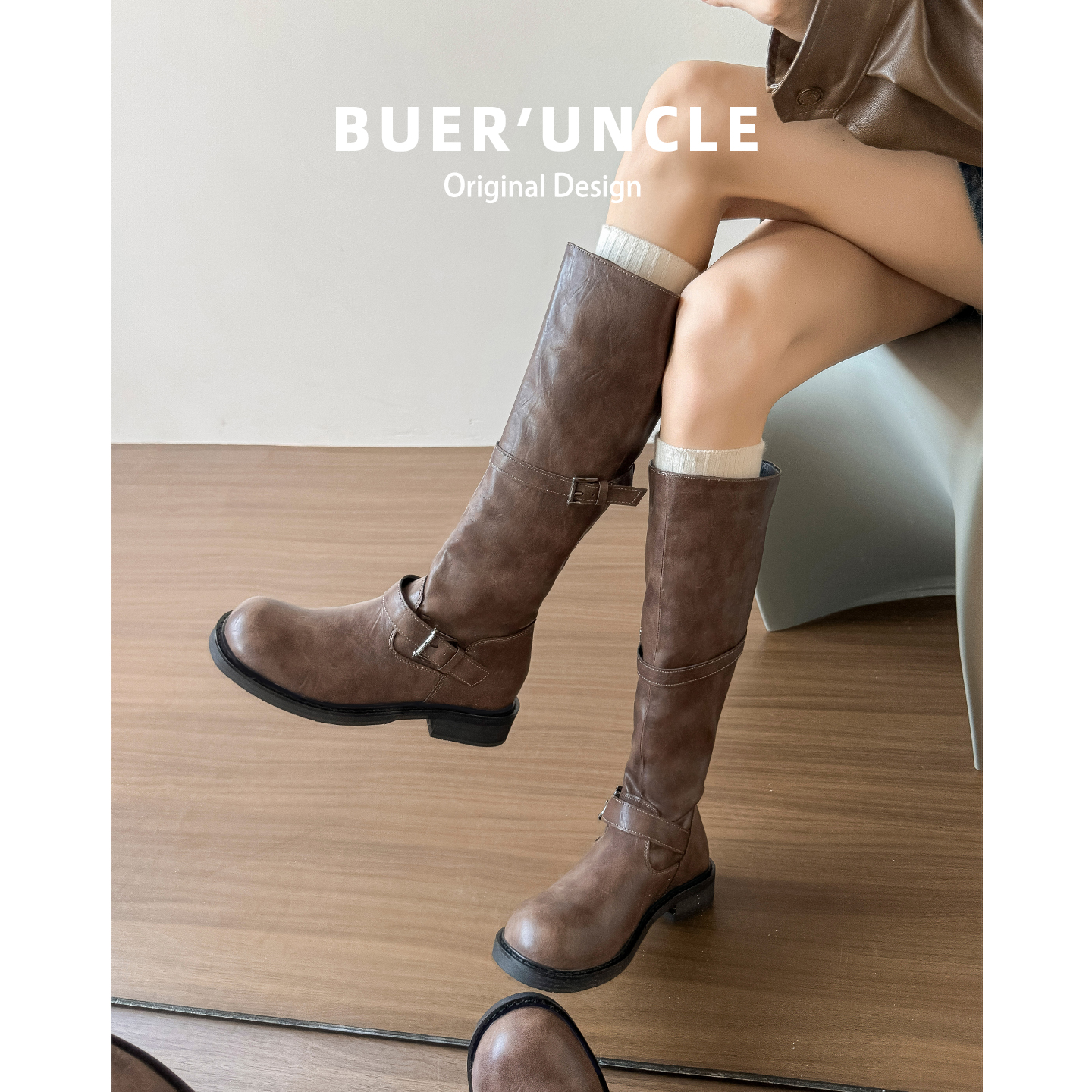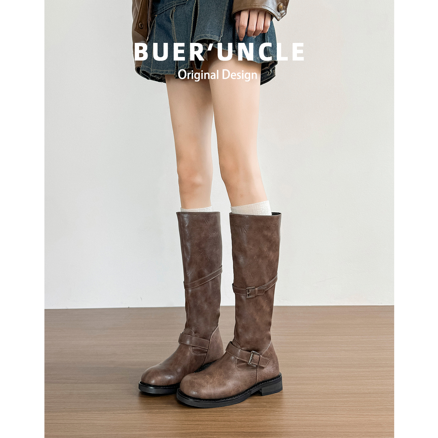 長筒靴女美拉德復古擦色堆堆靴做舊皮帶扣廢土風騎士長靴 真皮由