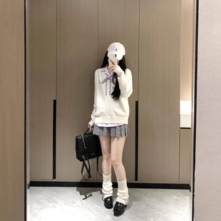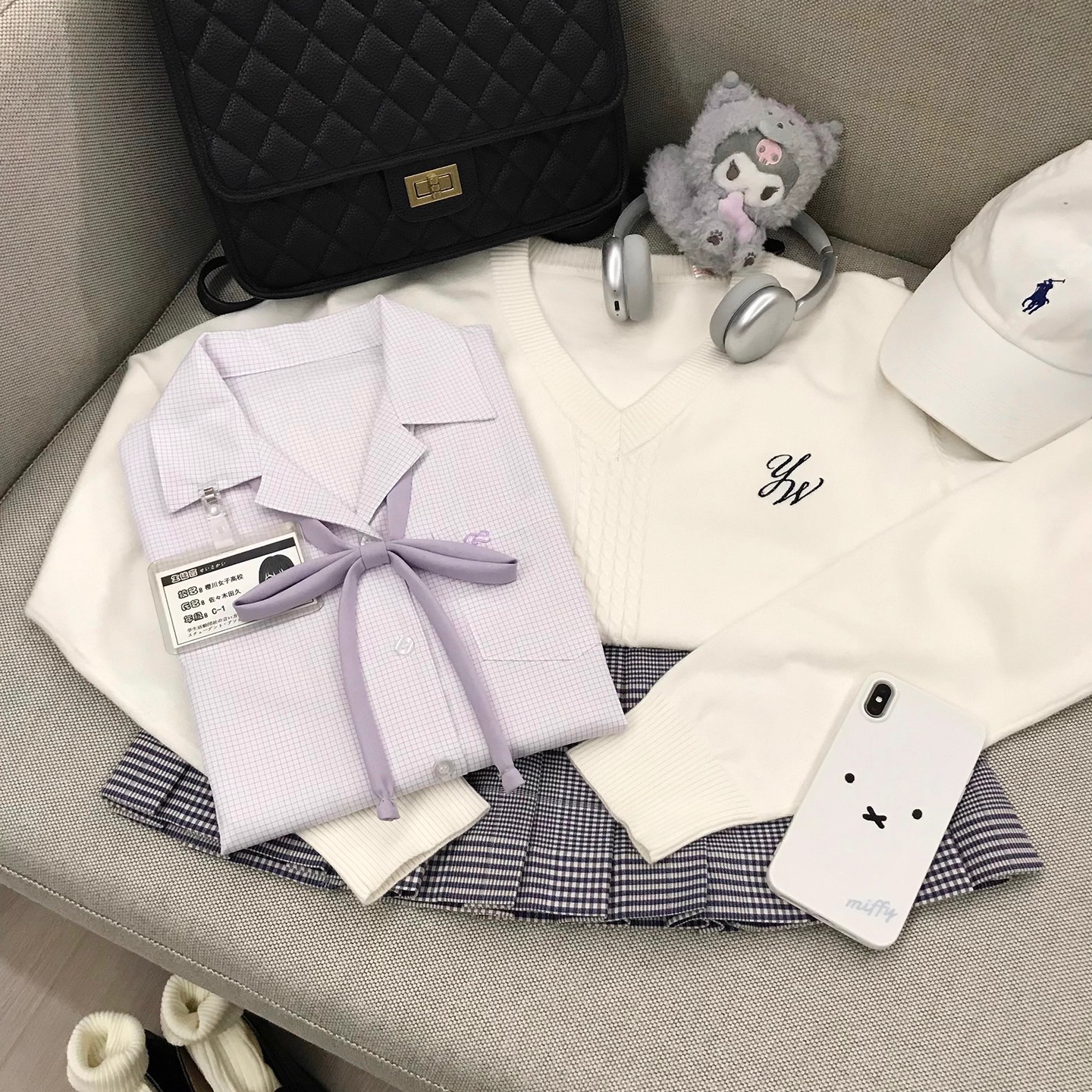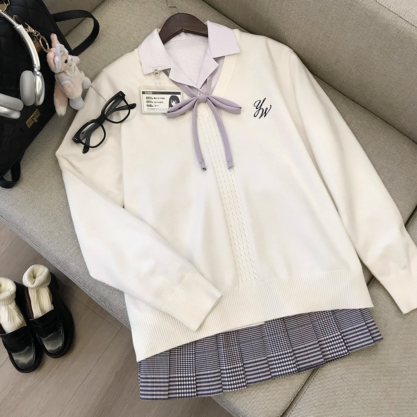 魚丸原創JK毛衣套裝 秋冬校供感 V領套頭奶白色學院風刺繡針織衫由