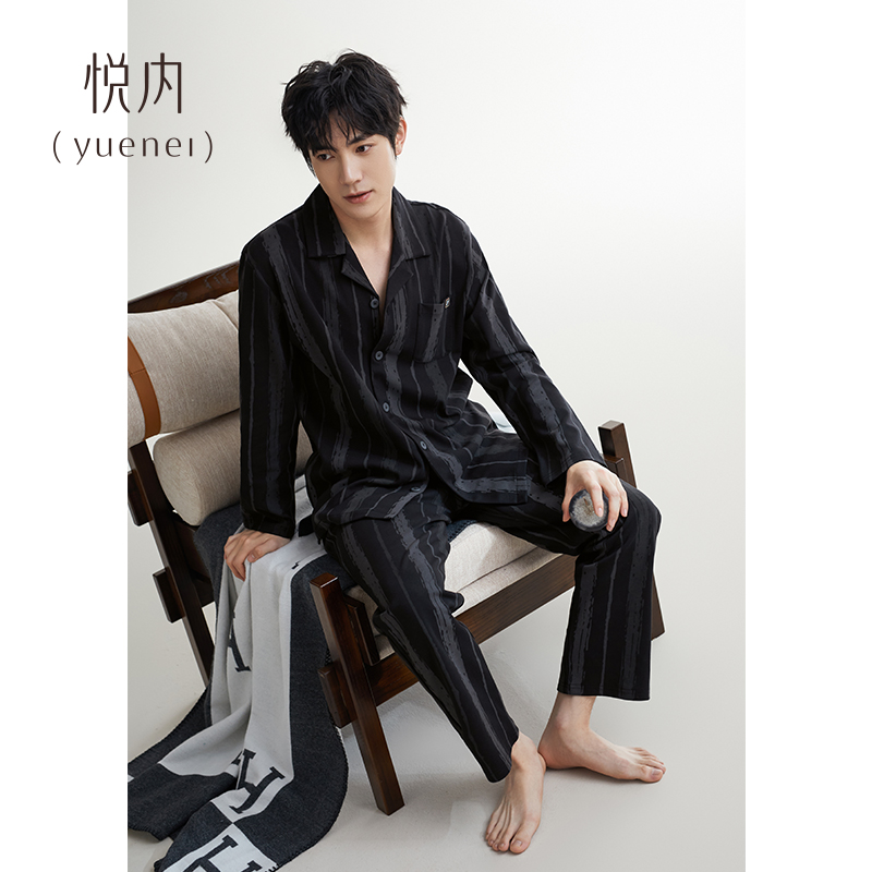 純棉長袖 秋季 春秋款 四季 通用高級感黑套裝 家居服男款 悅內睡衣男士由