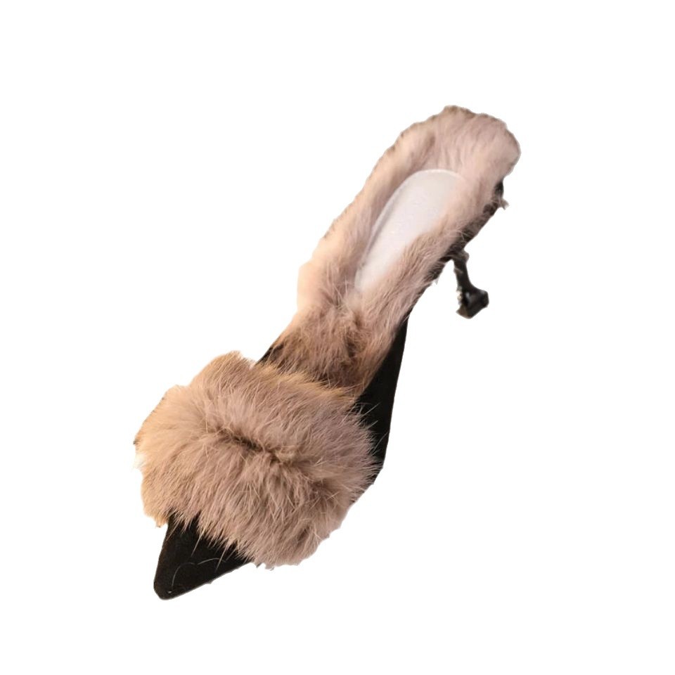 半拖鞋 毛毛鞋 百搭加絨尖頭包頭設(shè)計(jì)感高跟鞋 涼 中跟2024秋冬新款由