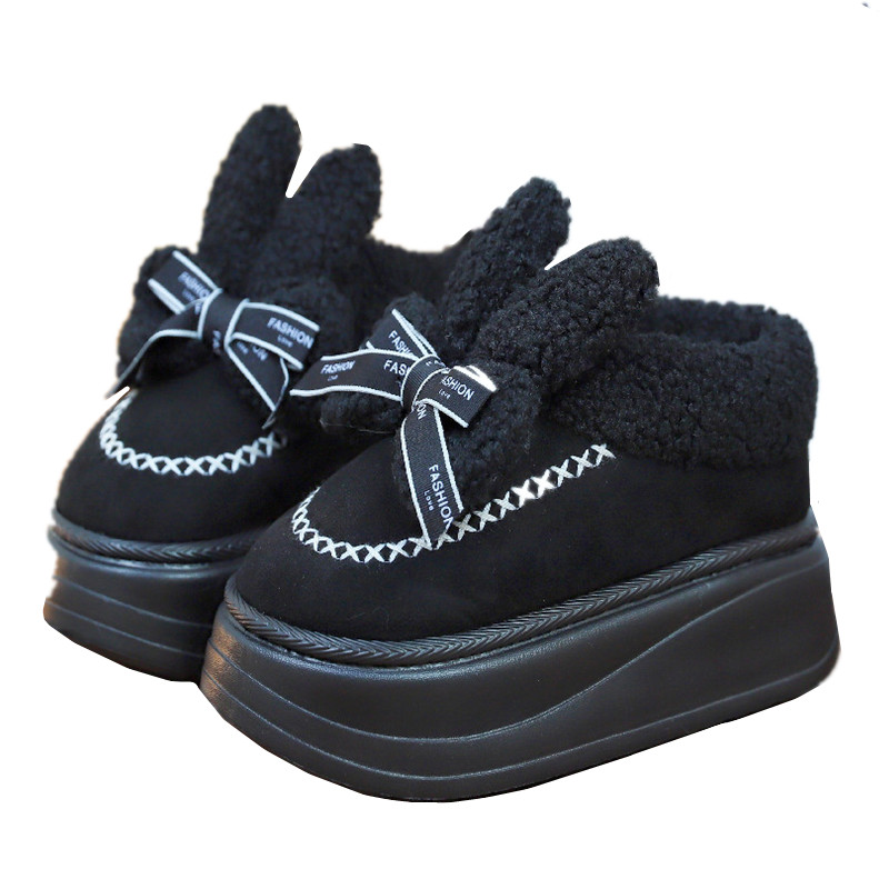 女冬棉鞋 外穿防滑舒適軟底 厚底包跟保暖高跟拖鞋 黑色兔耳朵棉拖鞋由