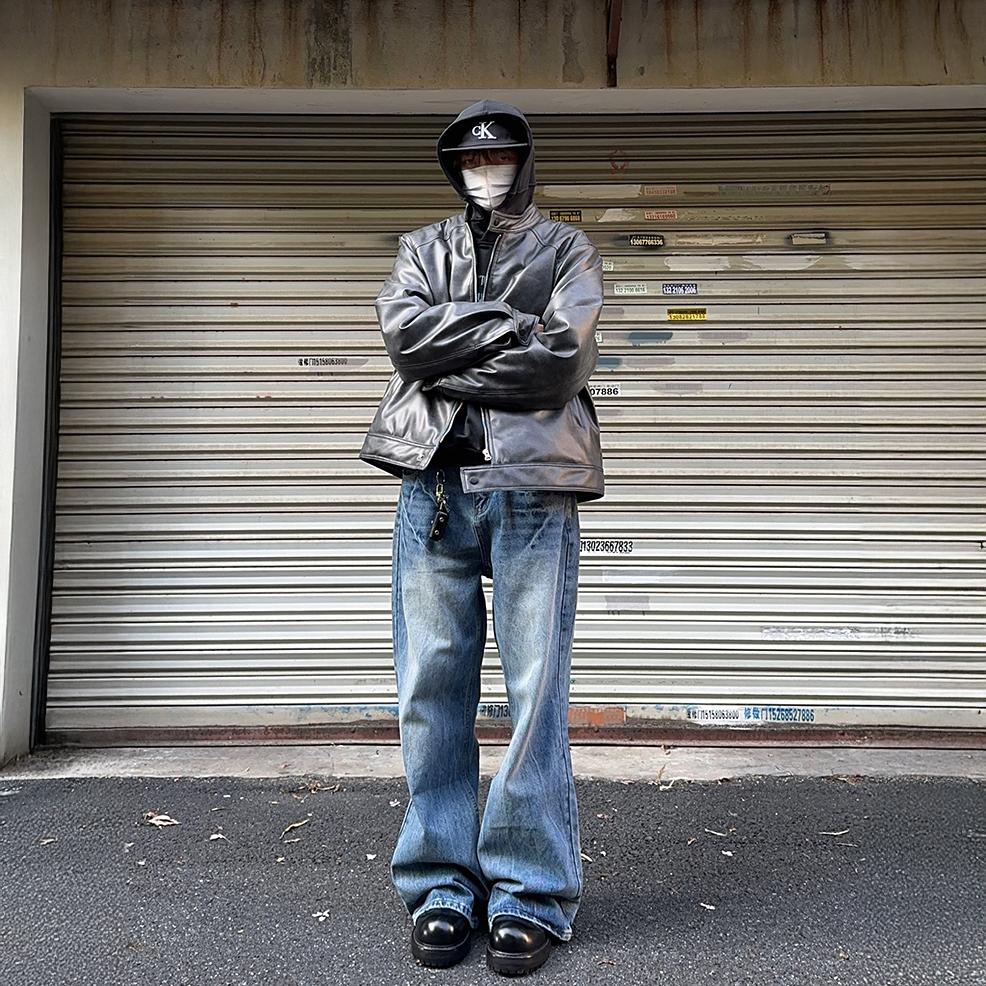 MAXNICEUP 高街閃電裂紋微喇叭牛仔褲 寬松潮牌設計感休閑褲 子 美式由