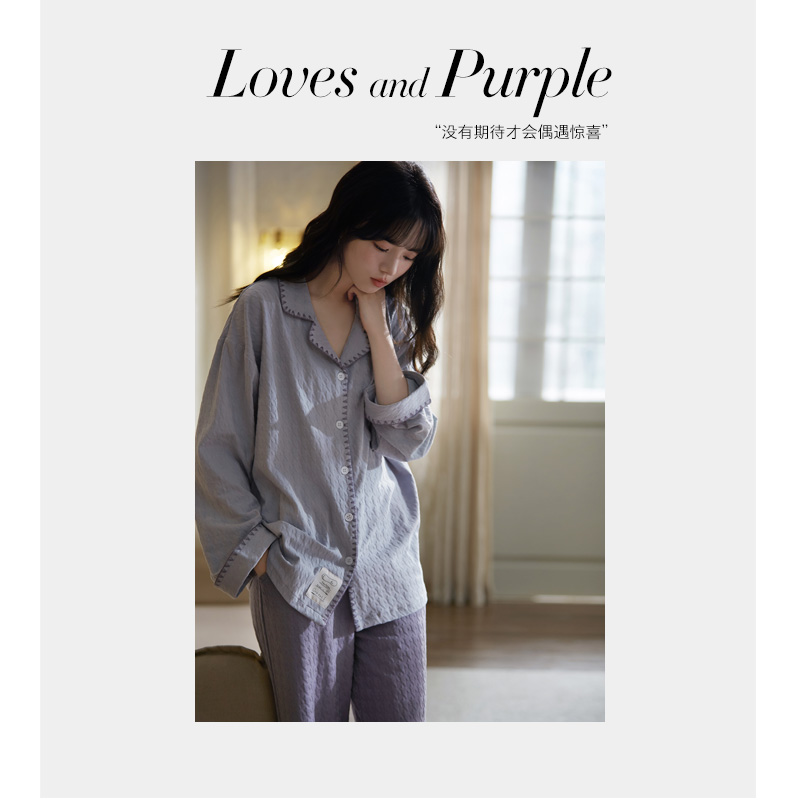高級感撞色法式 紫色慵懶風家居服 純棉長袖 思莉太太睡衣女春秋款由