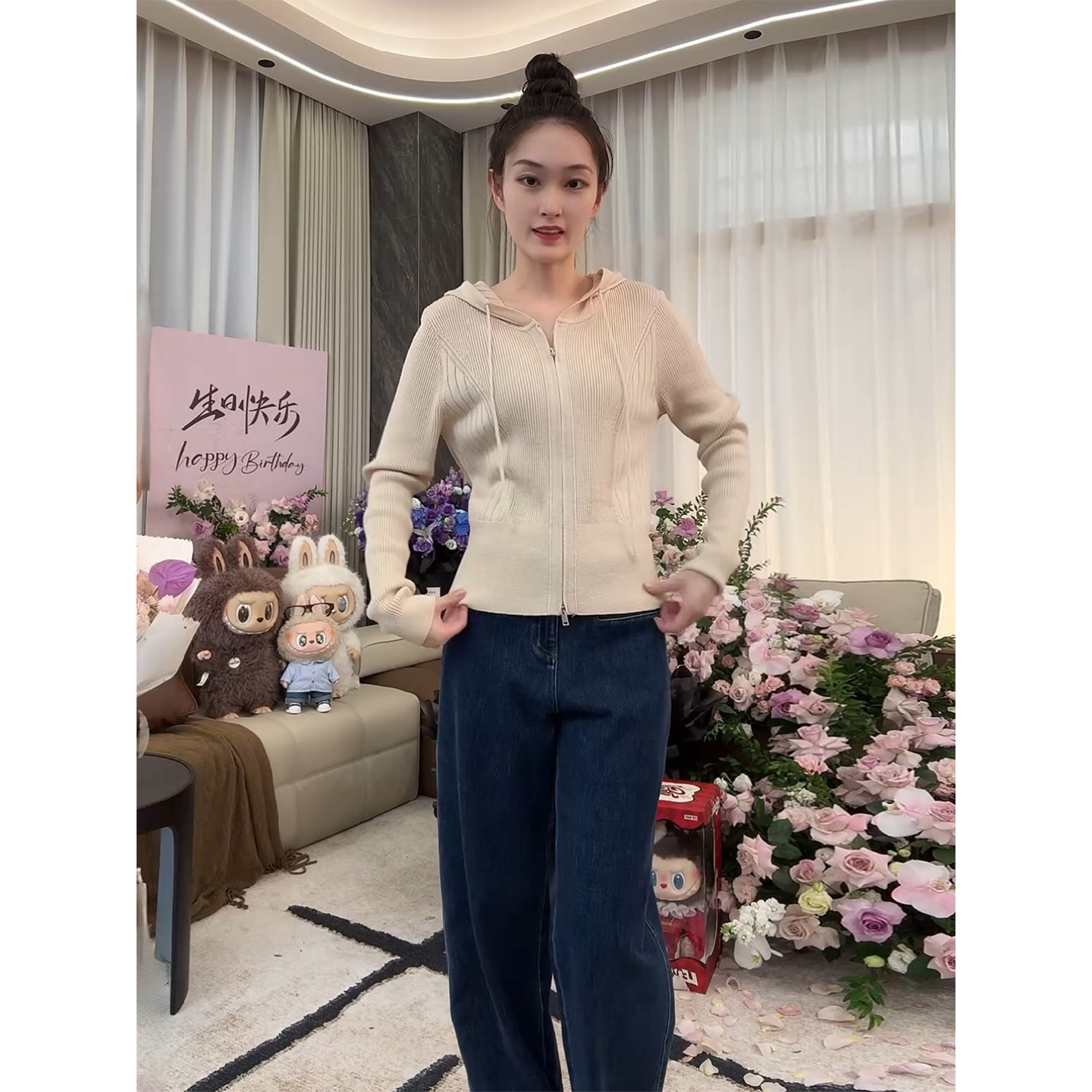 豎坑條綿羊毛連帽針織開衫 女秋休閑氣質(zhì)抽繩毛衣D0114 硬貨哥由