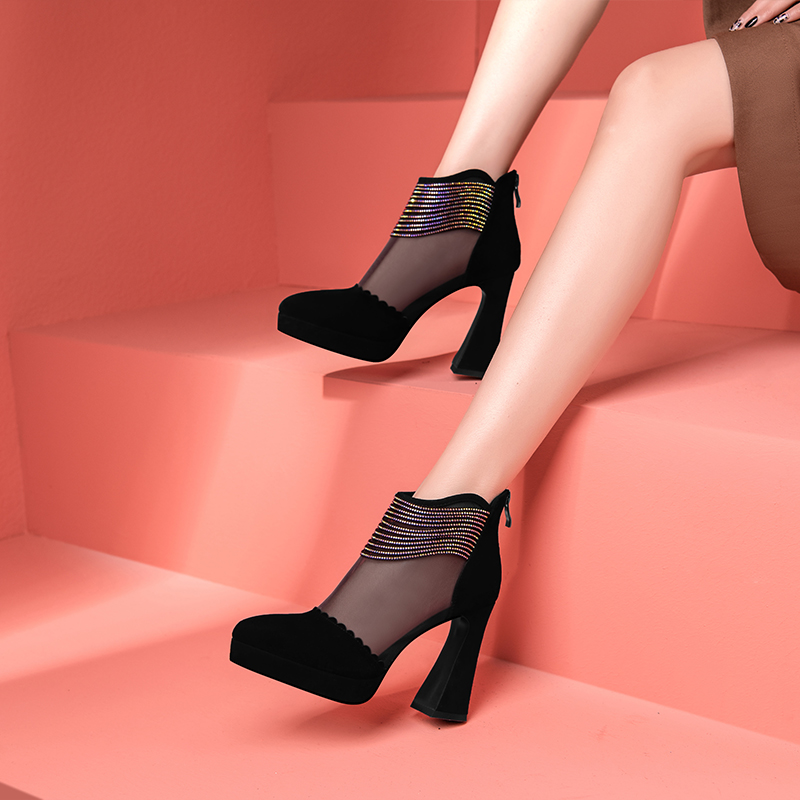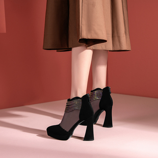 真皮粗跟防水臺單鞋 女2025春秋新款 鏤空網紗設計感氣質優雅高跟鞋由