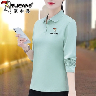 中年媽媽休閑寬松POLO衫 翻領上衣 t恤2025春秋新款 啄木鳥純棉長袖由