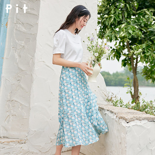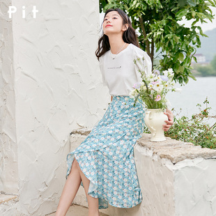 PIT不規則高腰碎花雪紡半身裙女夏裝 a字浪漫魚尾裙子 新款由