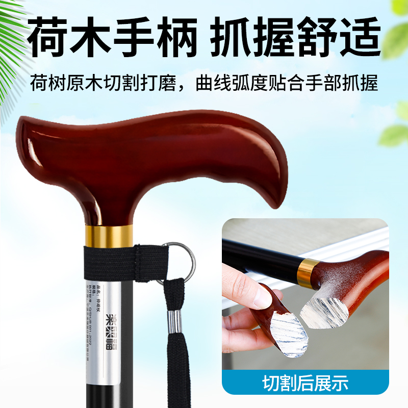 日本樂來福老人拐杖實木手柄伸縮四腳手杖輕便穩固防滑老年人拐棍由