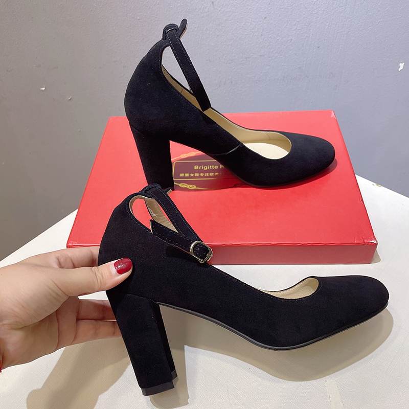 歐美風格 粗跟圓頭一字帶羊反絨真皮女鞋 OL職業高跟鞋 2025早春新品由