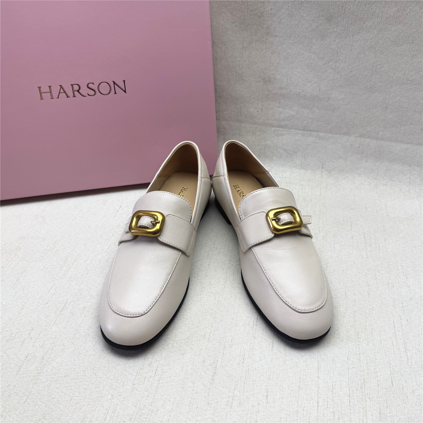女春秋新款 Harson 哈森撤柜正品 百搭低跟圓頭舒適樂福鞋 真皮單鞋由