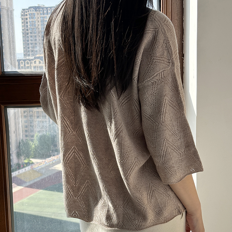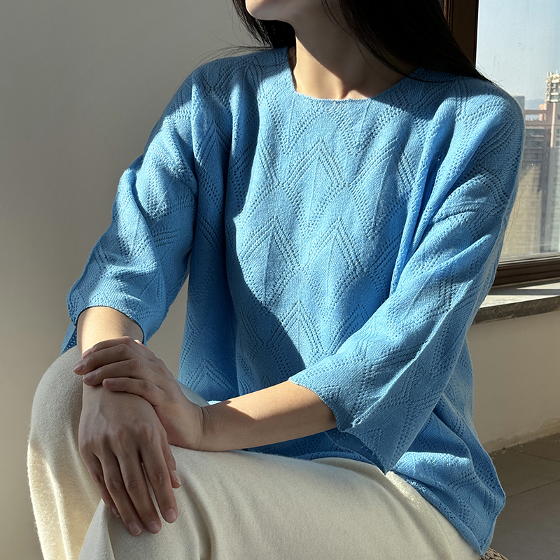 寬松薄款 氛圍感毛衣 天絲山羊絨混紡絞花圓領鏤空針織衫 芝美日禾