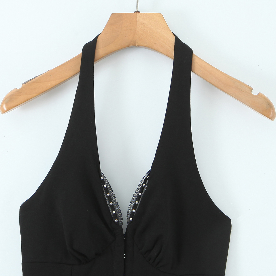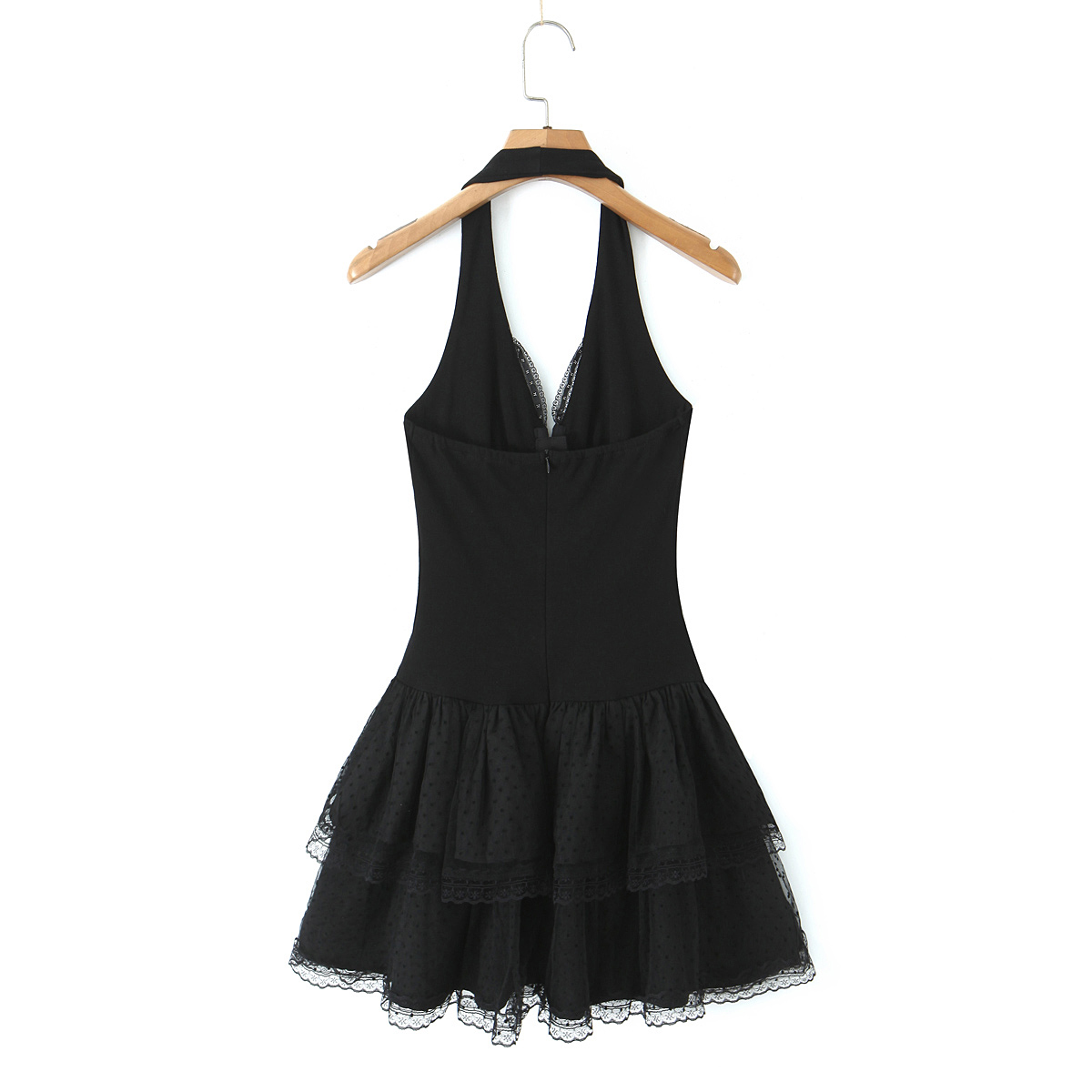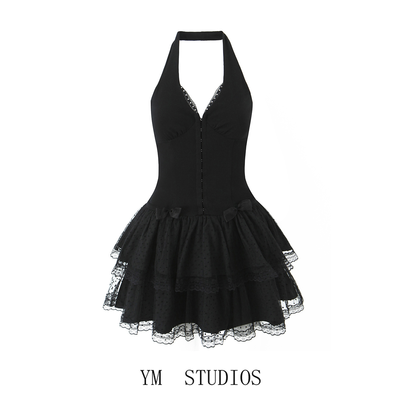 法式 辣妹低胸掛脖黑色連衣裙小個子蕾絲花邊迷你蓬蓬短裙 包郵由