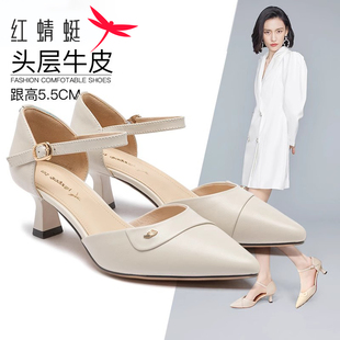 包頭中空一字帶高跟鞋 紅蜻蜓2025新款 女鞋 夏季 細跟尖頭真皮涼鞋由