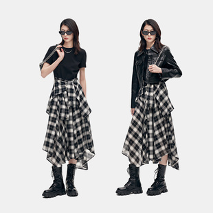 收腰不規則裙擺女氣質格紋拼接短袖 長裙 新款 FF仿佛連衣裙2025秋季