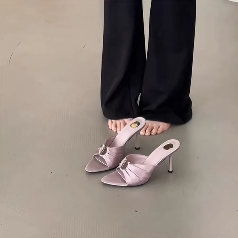 紫色尖頭高跟涼拖鞋 氣質金屬扣褶皺性感細跟露趾涼拖 女夏2025新款由