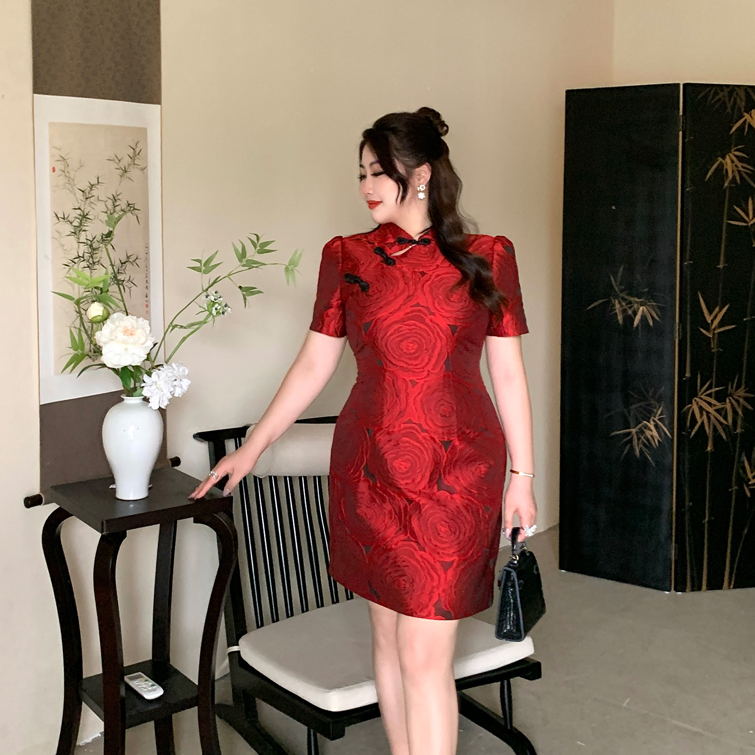 高端胖mm新中式 國風復古紅色提花氣質(zhì)改良旗袍連衣裙 女裝 GLEC大碼由