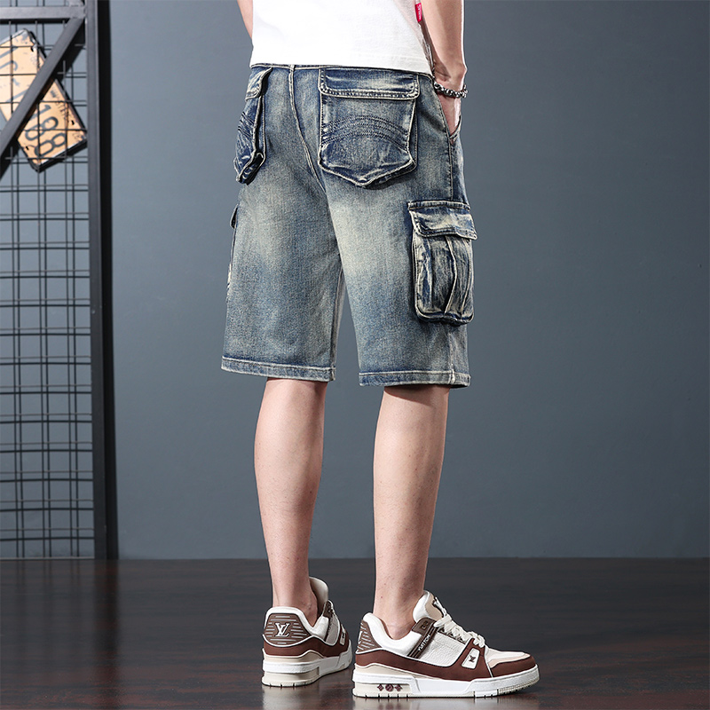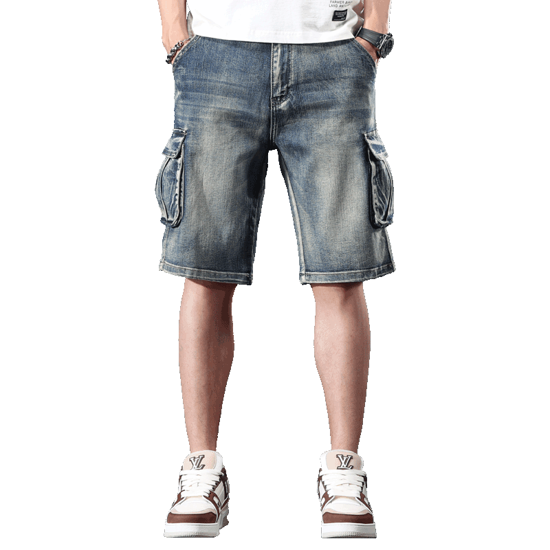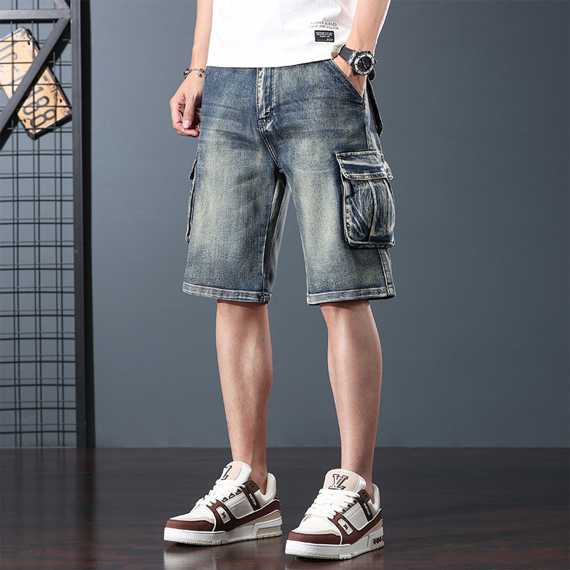 直筒大碼 懷舊寬松多口袋工裝 彈力牛仔短褲 男潮五分褲 闊腿5分中褲由