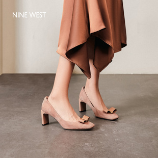粗跟淺口單鞋 Nine 蝴蝶結真皮 新款 女2025秋季 West 玖熙方頭高跟鞋由
