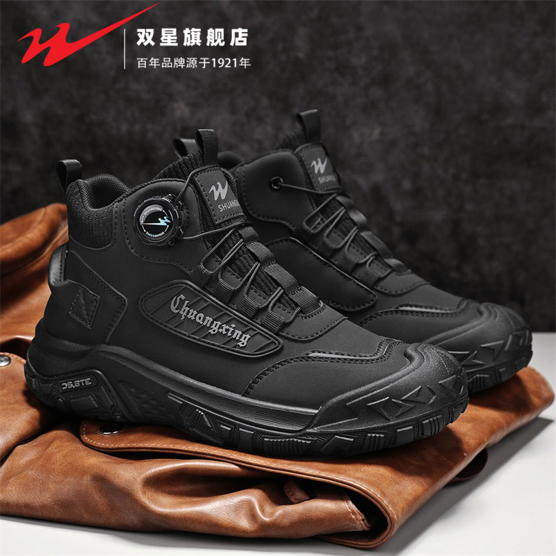 雙星工裝 春秋款 2025新款 皮面防水防滑厚底運動黑色高幫馬丁靴 男鞋由