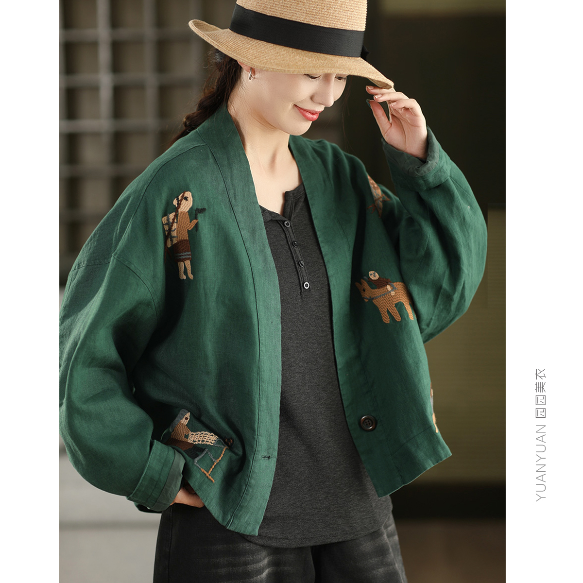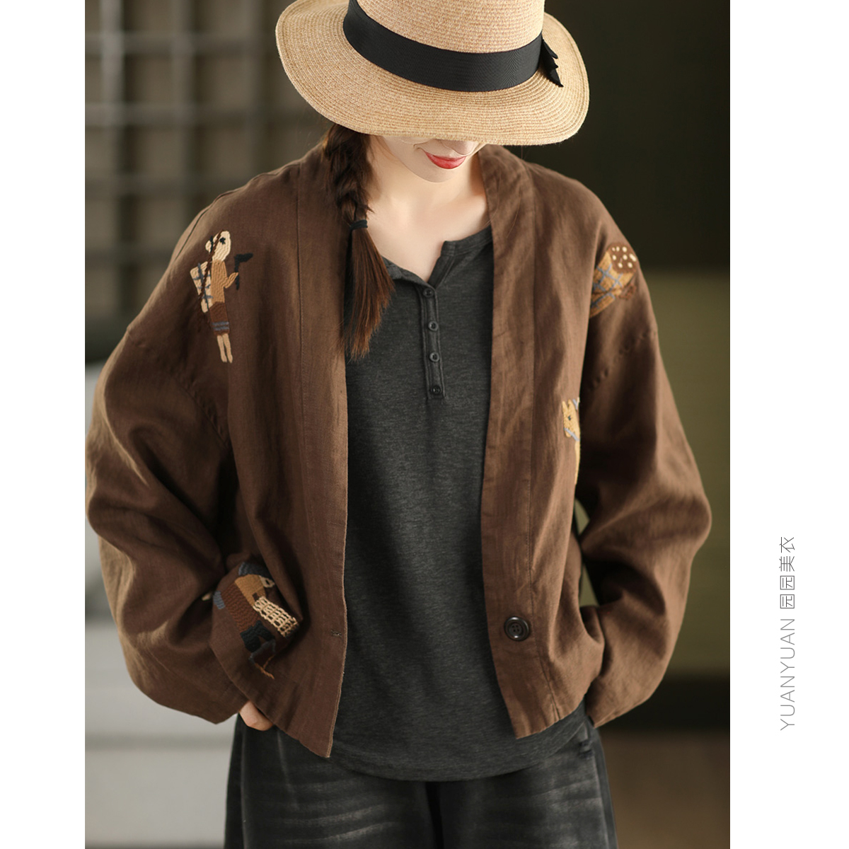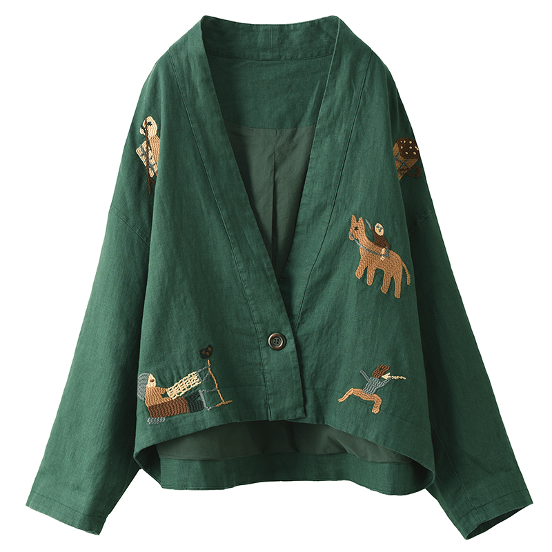 文藝寬松開衫 外搭上衣 重工刺繡100%砂洗漢麻短外套女雙層秋季 新款由