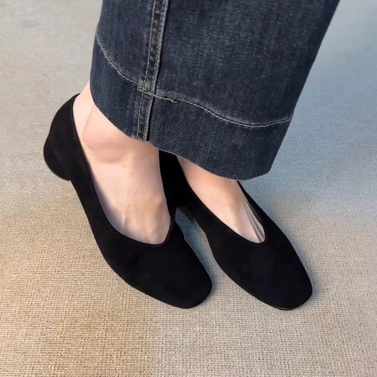 法式 女淺口通勤方頭高跟鞋 磨砂絨面一腳蹬奶奶鞋 氣質極簡粗跟單鞋由