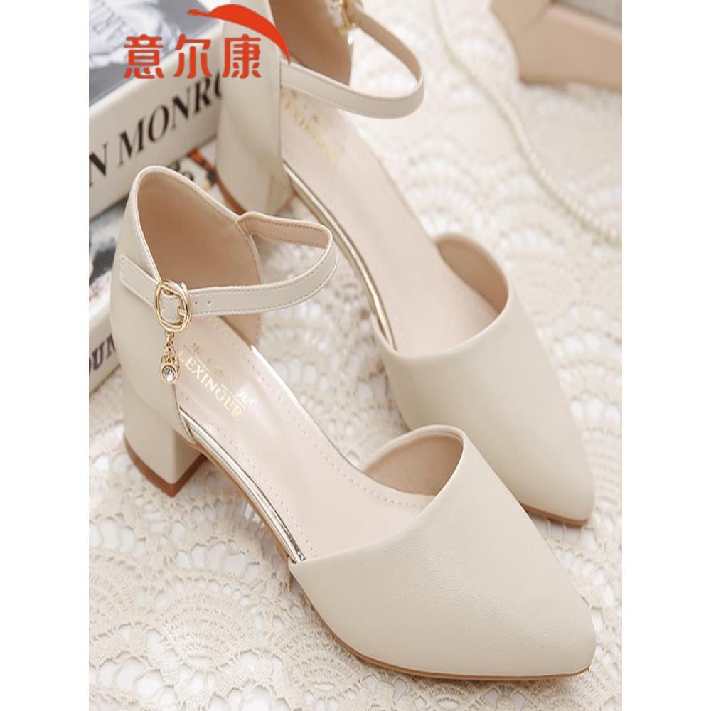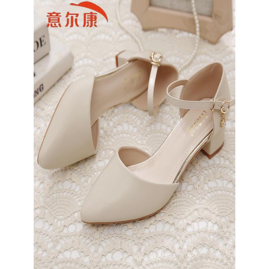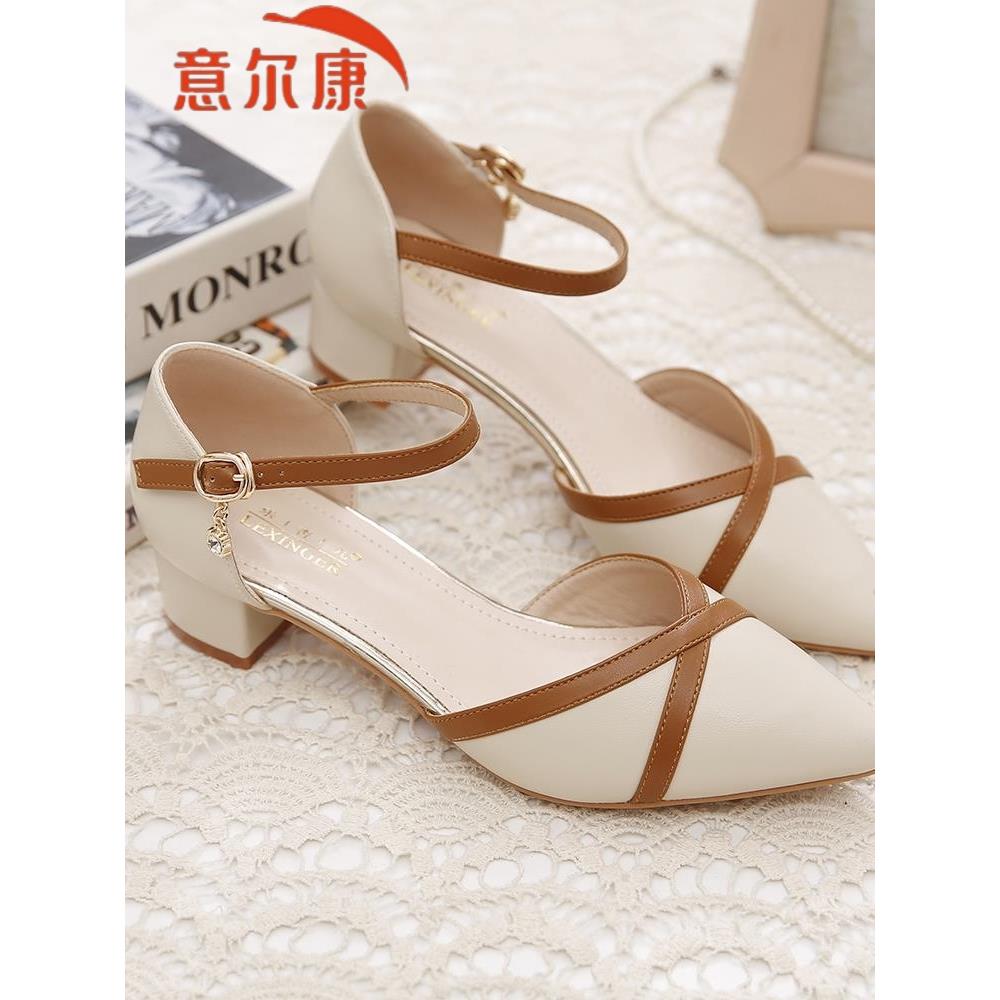 意爾康包頭涼鞋 新款 時尚 百搭簡約一字扣帶尖頭粗跟中跟 女2025夏季由