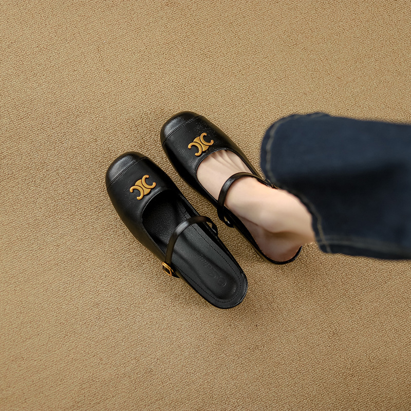 內增高涼拖真皮銀色瑪麗珍鞋 圓頭金扣法式 后空穆勒半拖鞋 淑女單鞋由
