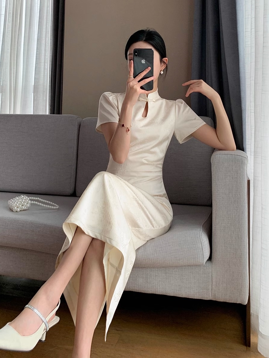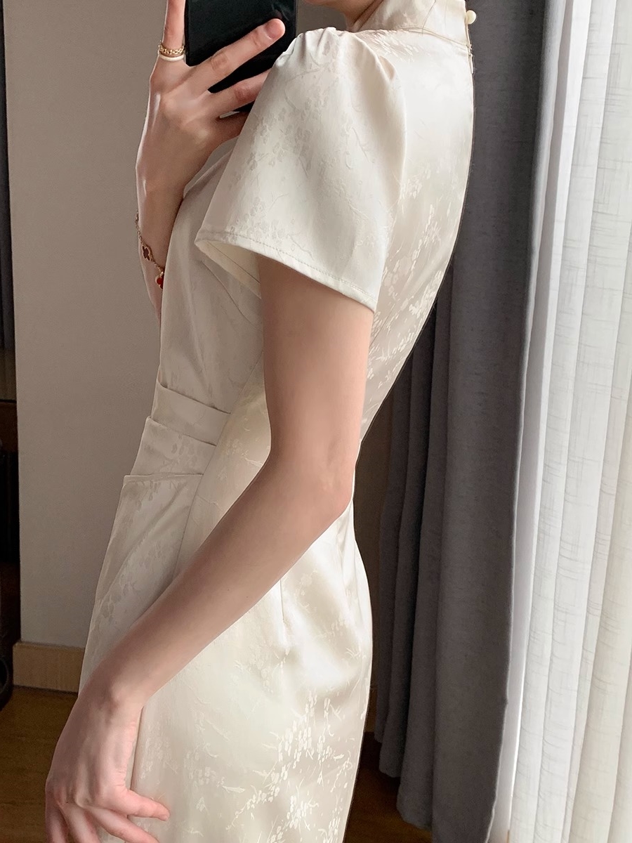 新款 超好看顯瘦緞面改良旗袍伴娘服 米白色連衣裙女2025夏季 新中式由