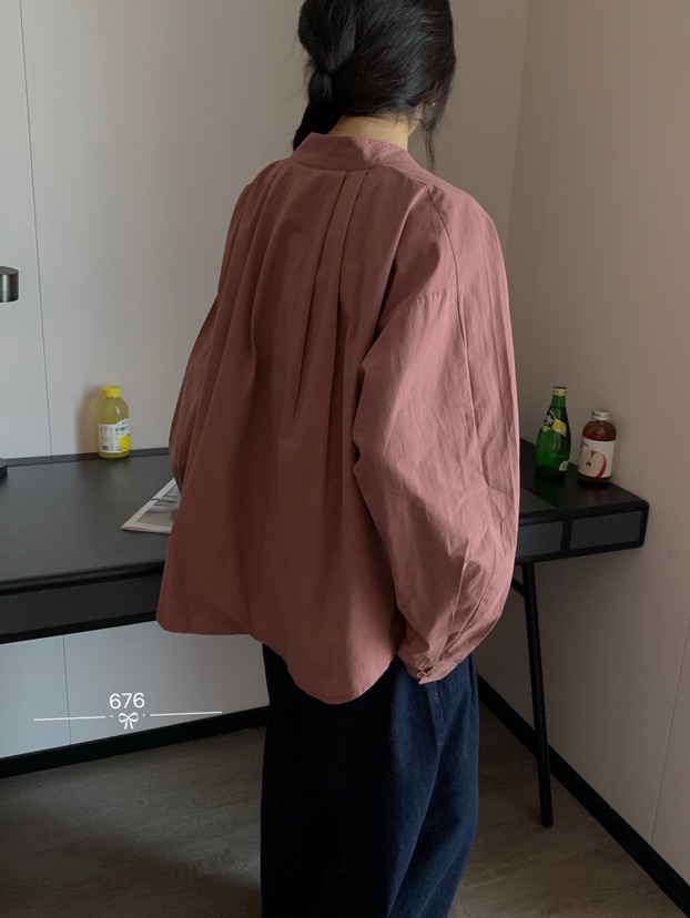 寬版 B204法式 文藝 簡約寬松休閑長袖 新款 收褶立圓領襯衫 女秋季由
