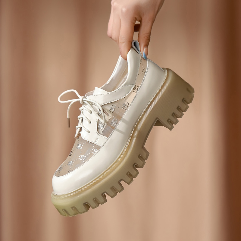 女坡跟松糕底透氣米白色刺繡單鞋 真皮厚底網紗系帶樂福鞋 25夏新款由