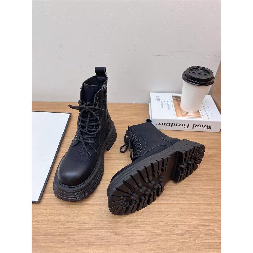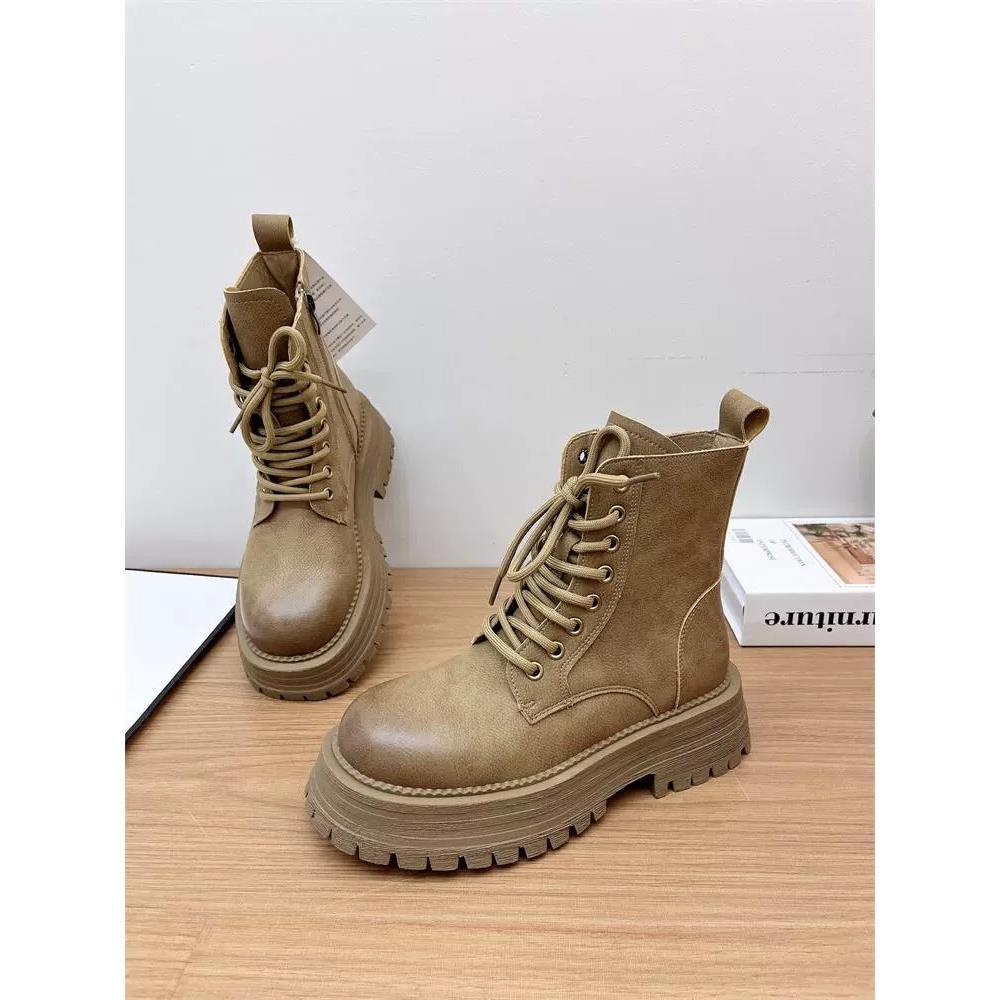 2024秋冬新款 休閑系帶英倫風機車馬丁靴 真皮厚底短筒靴女復古工裝由
