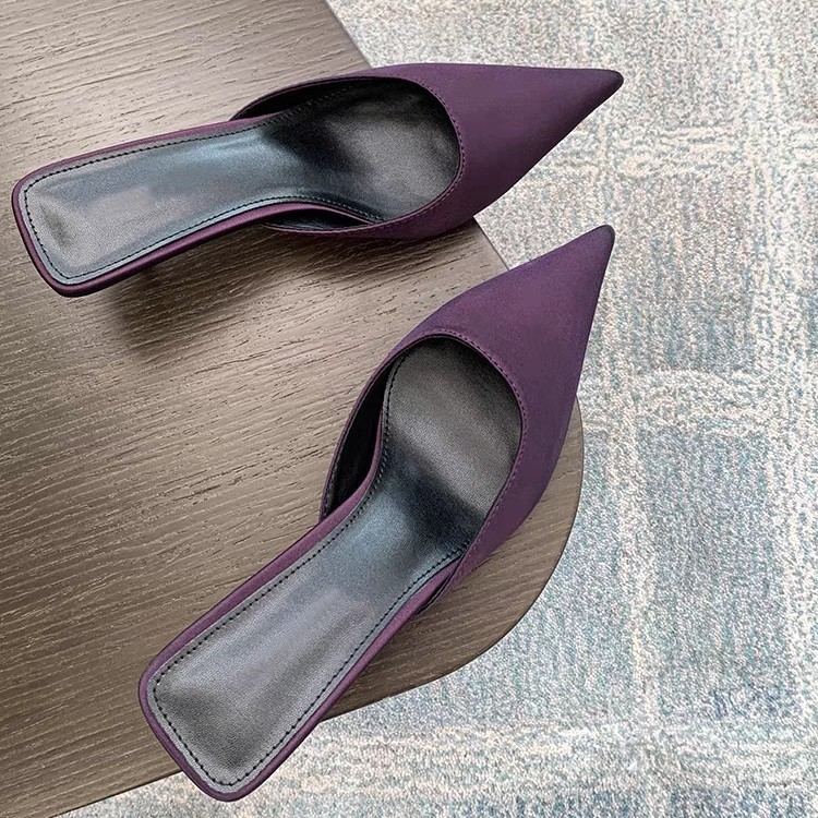黑色綢緞高跟鞋 半拖穆勒鞋 2025秋新款 包頭小 女尖頭后空涼拖鞋由