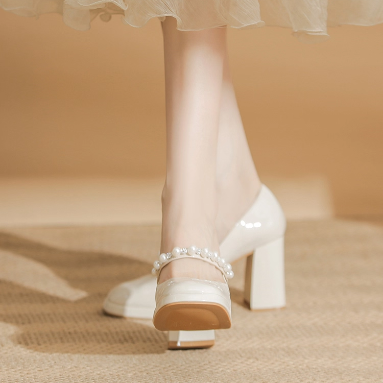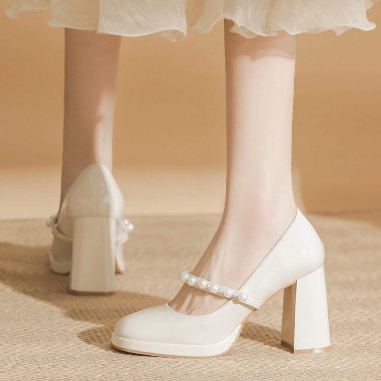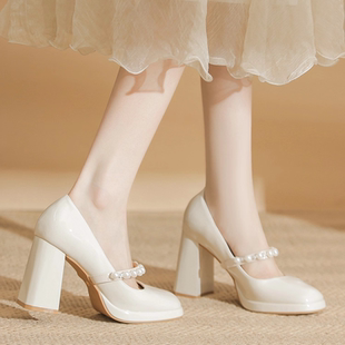 防水臺高跟鞋 法式 圓頭米白色一字帶厚底瑪麗珍單鞋 女粗跟2025新款由