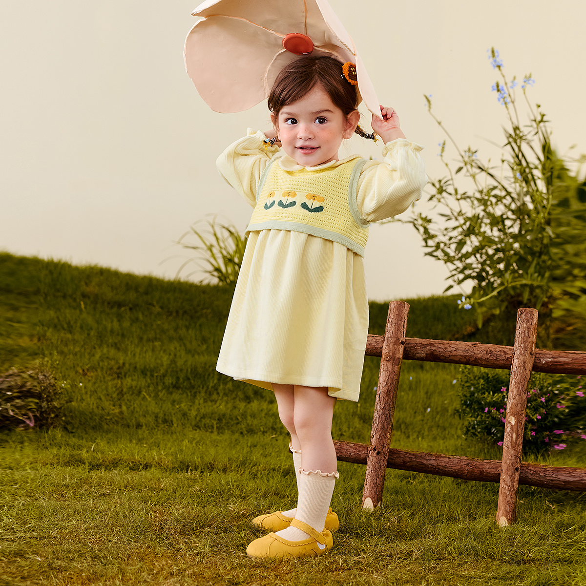 拼接甜美花邊裙子 迷你巴拉巴拉女童連衣裙假兩件2025秋新寶寶毛衫由