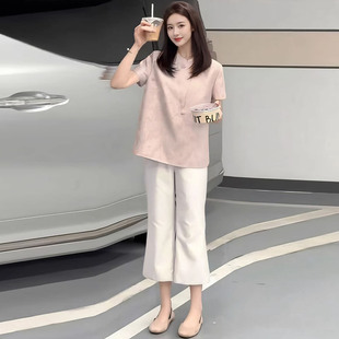 寬松顯瘦短袖 韓系高級感露肩休閑套裝 女夏季 時尚 運動兩件套 闊腿褲