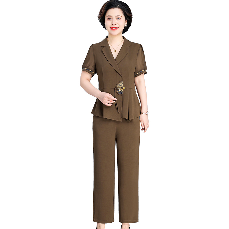 中老年媽媽夏季 短袖 休閑套裝 女貴夫人洋氣質上衣服兩件套 雪紡小衫由