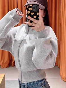 開衫 灰色連帽衛衣外套女款 收腰上衣早秋穿搭美式 短款 秋冬新款 修身
