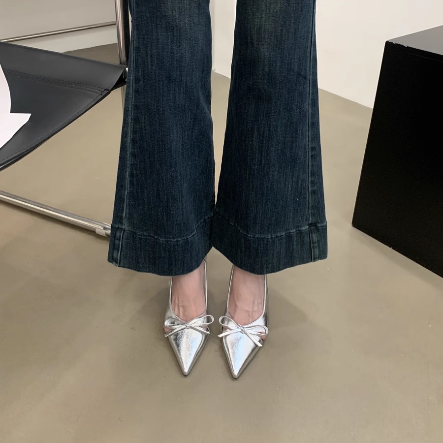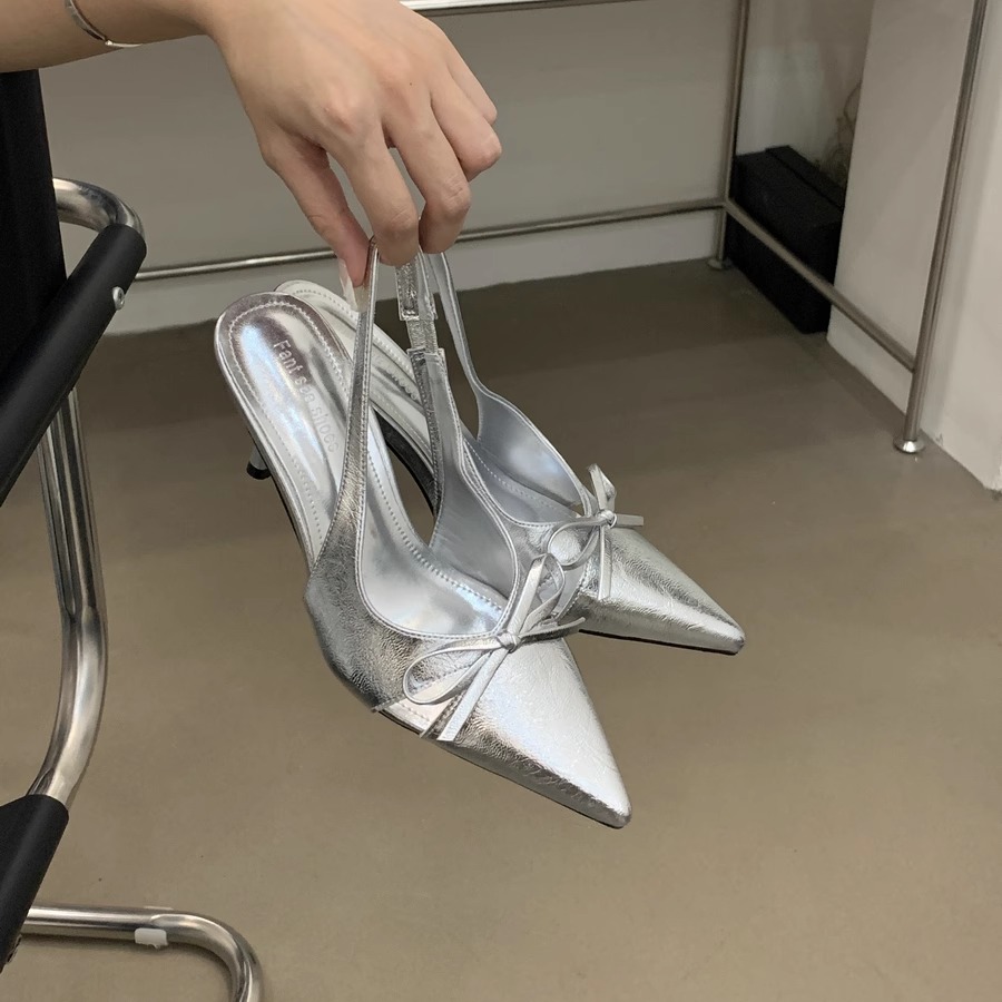 裸粉色包頭后空涼鞋 新款 氣質(zhì)百搭尖頭細(xì)跟漆皮蝴蝶結(jié)高跟鞋 女夏季由
